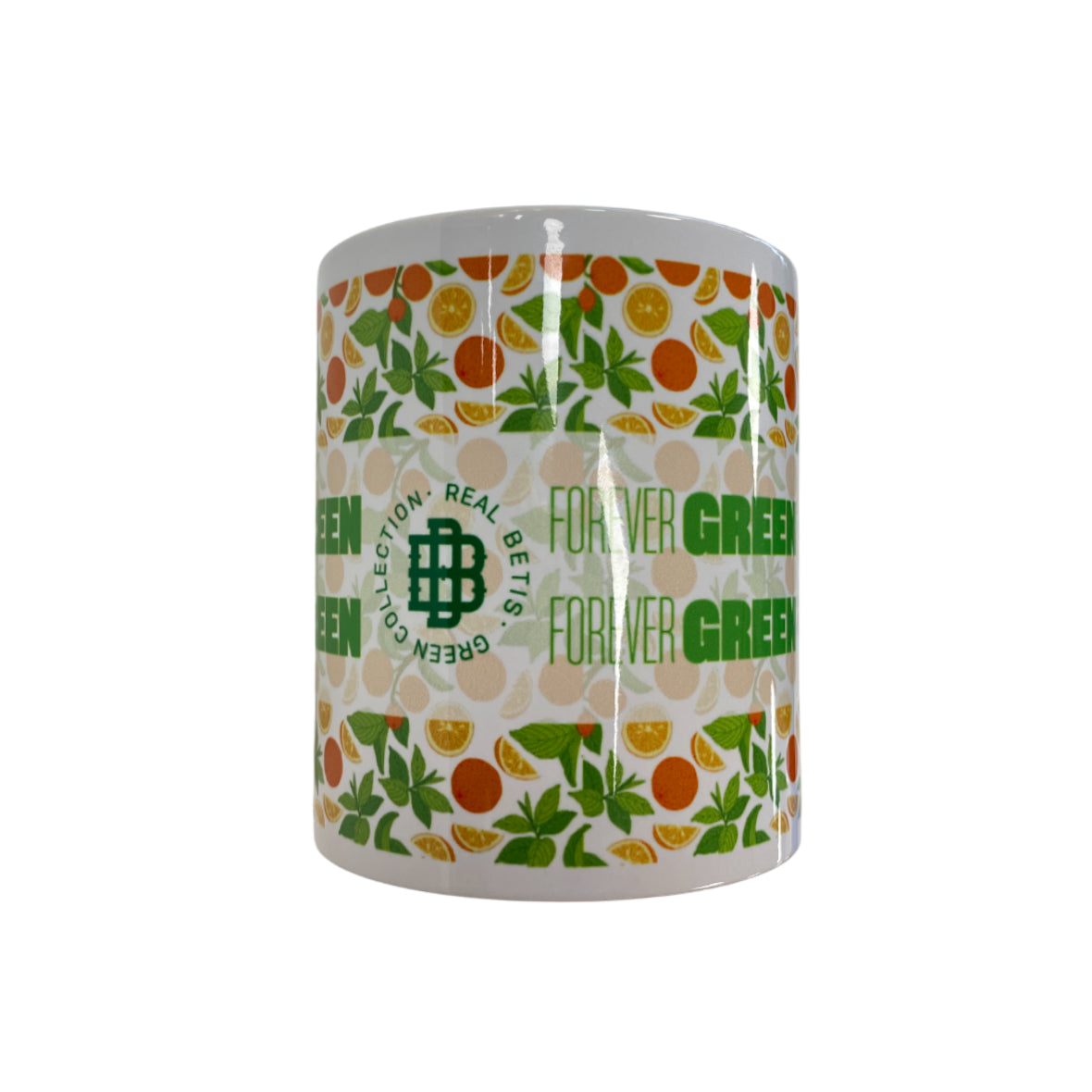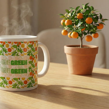Taza clásica de cerámica en color blanco, decorada con un estampado de naranjas de Sevilla, símbolo de la identidad local y presente en toda la colección Forever Green.