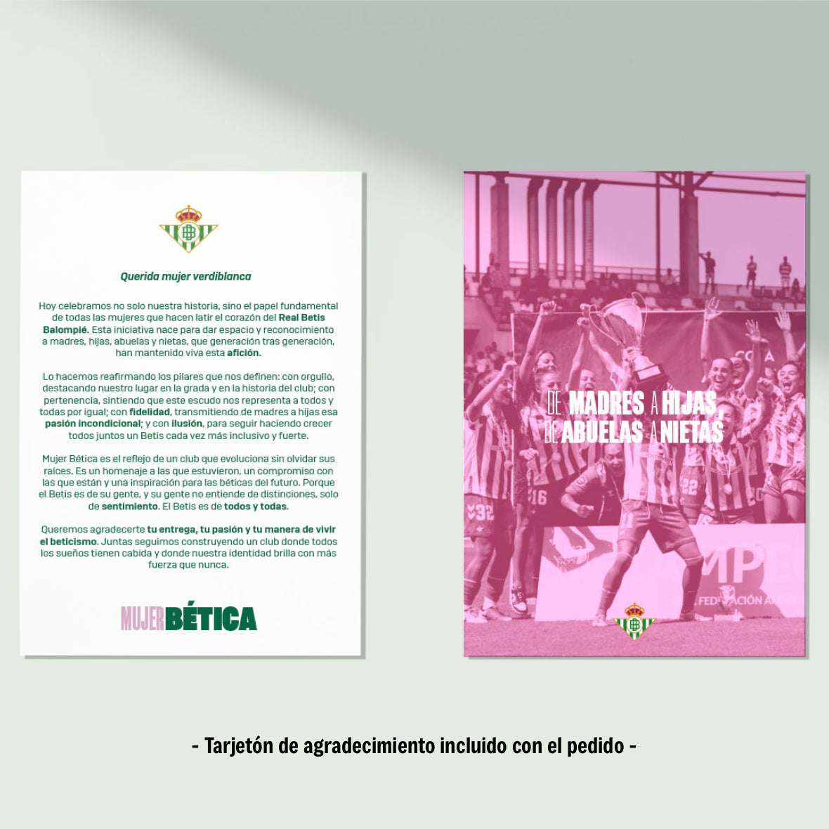 La Camiseta Real Betis Balompié Mujer Bética 25/26 forma parte de la Colección Mujer Bética, creada para conmemorar a todas las mujeres que sostienen el beticismo en cada generación: madres, hijas, abuelas y nietas que comparten este sentimiento como un legado.