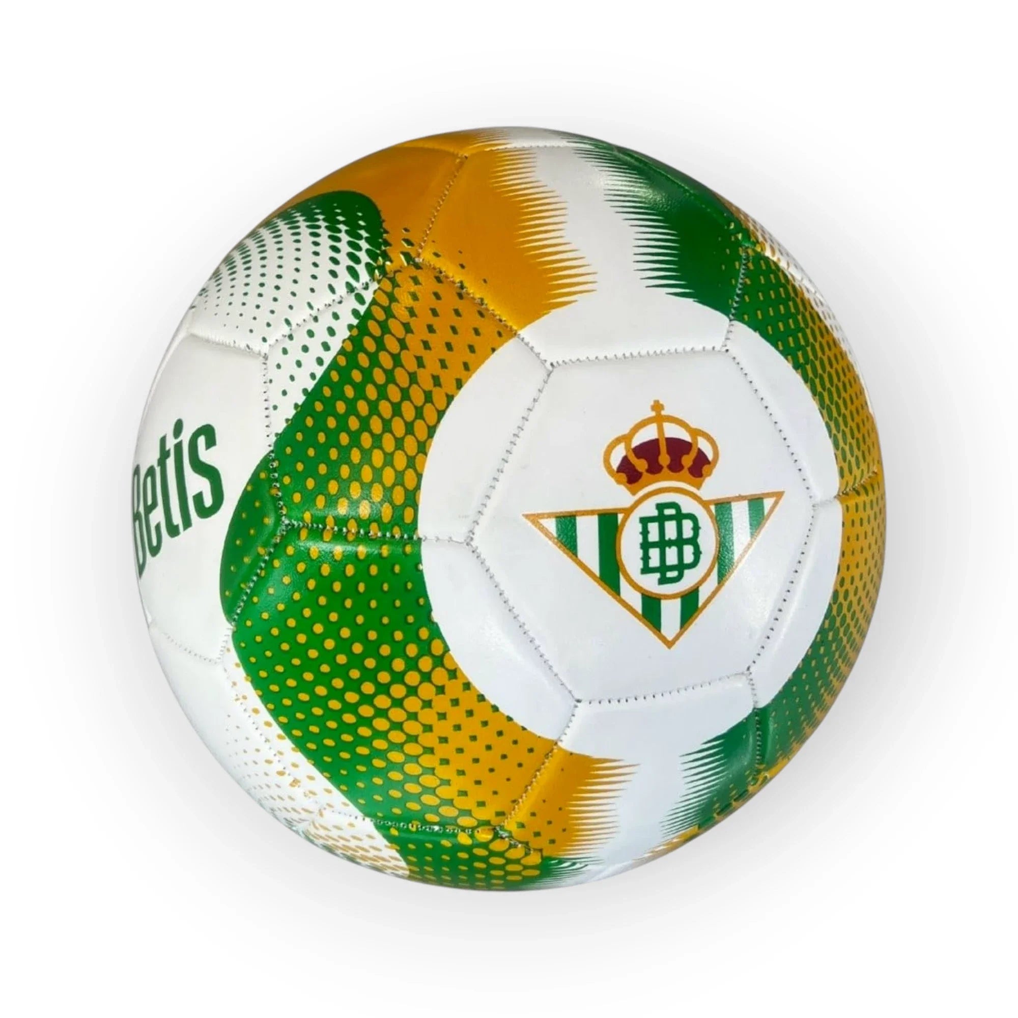El Balón Real Betis Balompié Verde/Dorado une elegancia y sentimiento verdiblanco en un diseño oficial pensado para disfrutar del fútbol en todo tipo de superficies. Su acabado en fondo blanco con un patrón en verde y dorado, acompañado del escudo y el nombre del Real Betis Balompié, lo convierten en un modelo atractivo y distintivo para jugadores y coleccionistas.